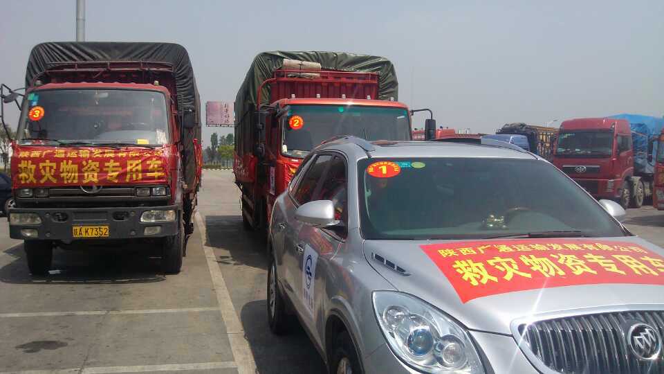 陜西廣通運(yùn)輸發(fā)展有限公司救援物資車(chē)隊(duì)于4月25日凌晨三點(diǎn)左右,抵達(dá)雅安市雨城區(qū)多營(yíng)鎮(zhèn)的物資集中配送點(diǎn)。本次救援物資運(yùn)送車(chē)隊(duì)由五輛大卡組成,共運(yùn)送了價(jià)值十多萬(wàn)元的救災(zāi)急需物資四十余噸;行程八百五十公里;用時(shí)十八小時(shí)。到達(dá)雅安物資集中配送點(diǎn)后,當(dāng)?shù)毓ど滩块T(mén)對(duì)這批物資進(jìn)行了檢驗(yàn)、登記。經(jīng)過(guò)四小時(shí)的緊急卸載,車(chē)隊(duì)于中午十二點(diǎn)離開(kāi)雅安。